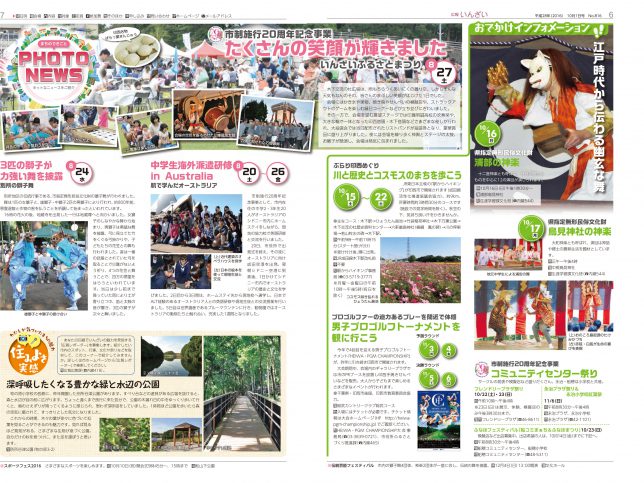 1日号は6・7面をカラーにして、市のイベントやまちの話題を掲載。写真をメインに市の魅力やまちの話題を発信します。