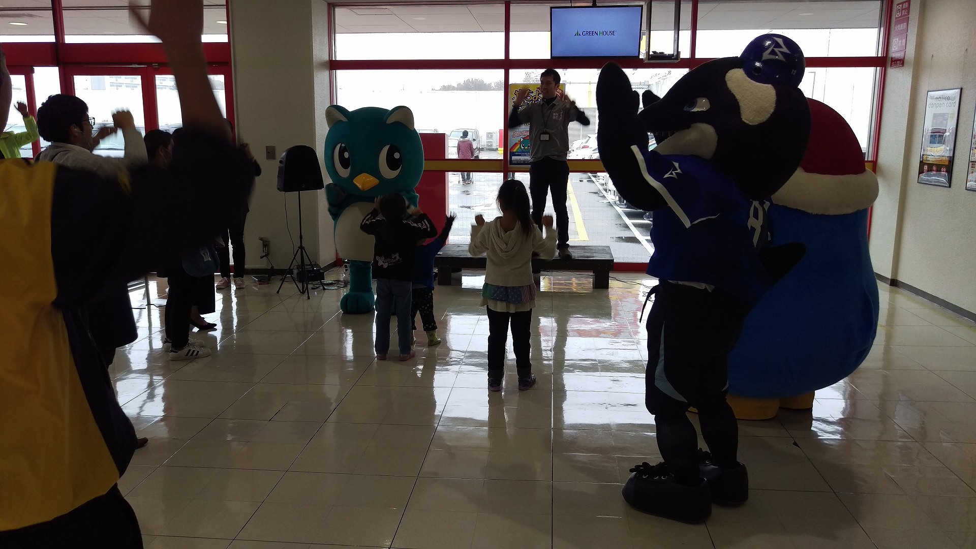 なんかいきなり八千代市のゆるキャラ「やっち」やドンキのキャラが体操してる。何なのか全く分かりません。カオスな空間・・。